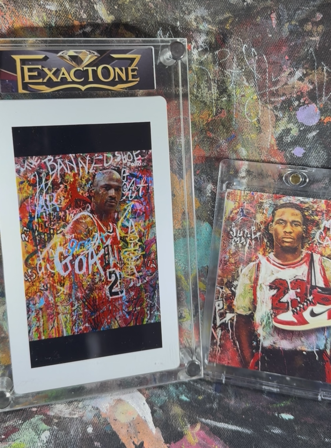 The Premium Hard Copy Art Card: A physical, archival-quality card featuring my original painting of Michael Jordan alongside his iconic signature shoe — printed on museum-grade stock, hand-signed and embellished by me, and inscribed as the very first EXACTONE card ever produced. This is the only physical card tied to this 1/1 set.